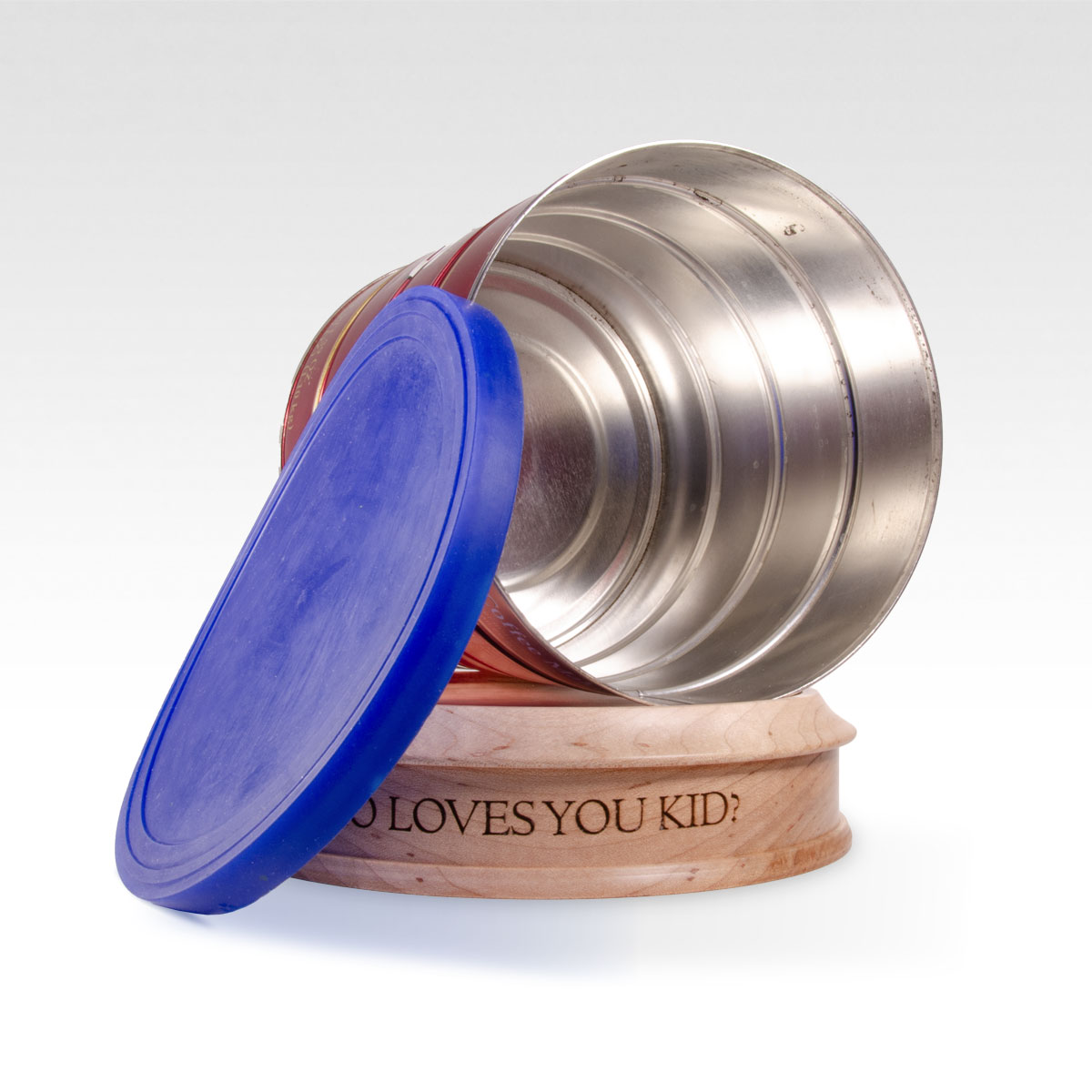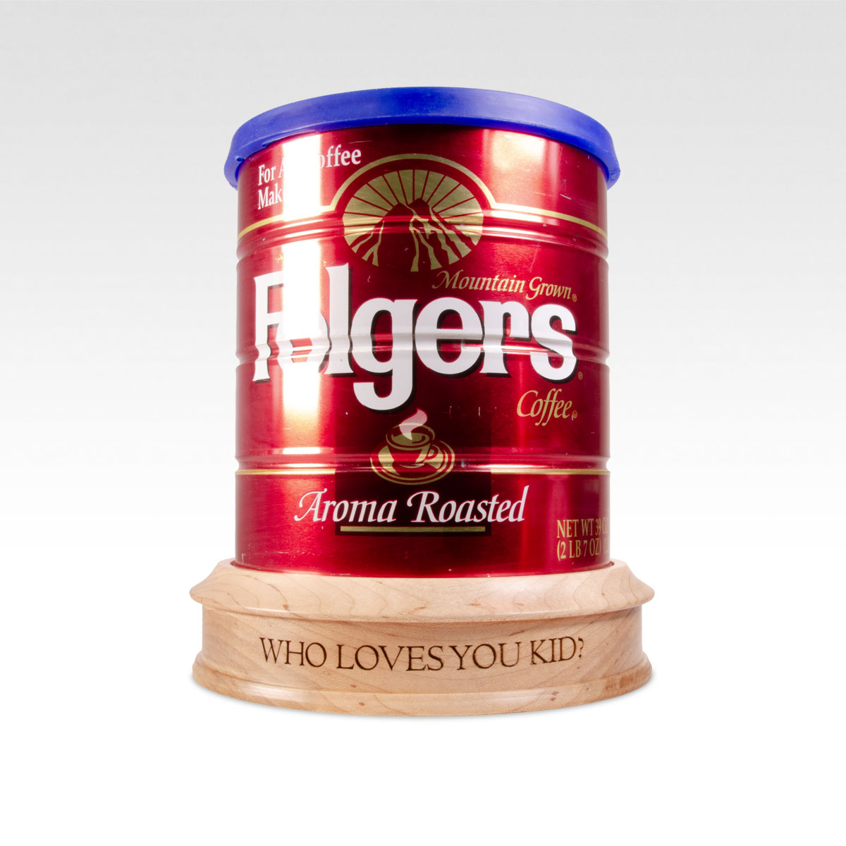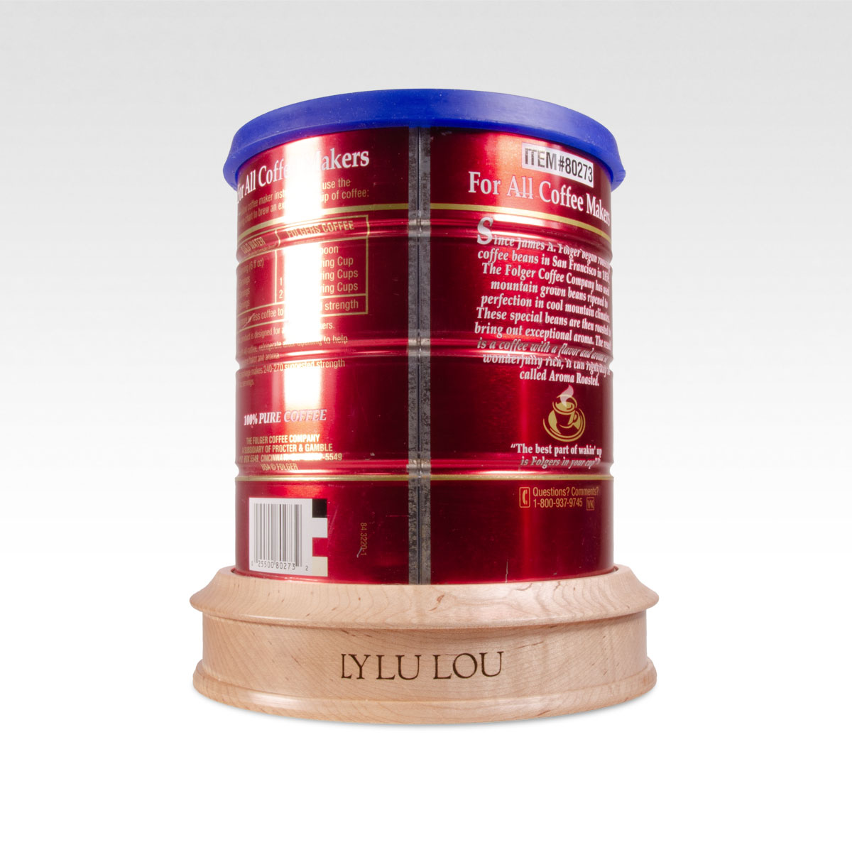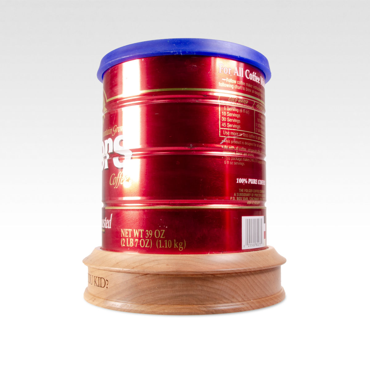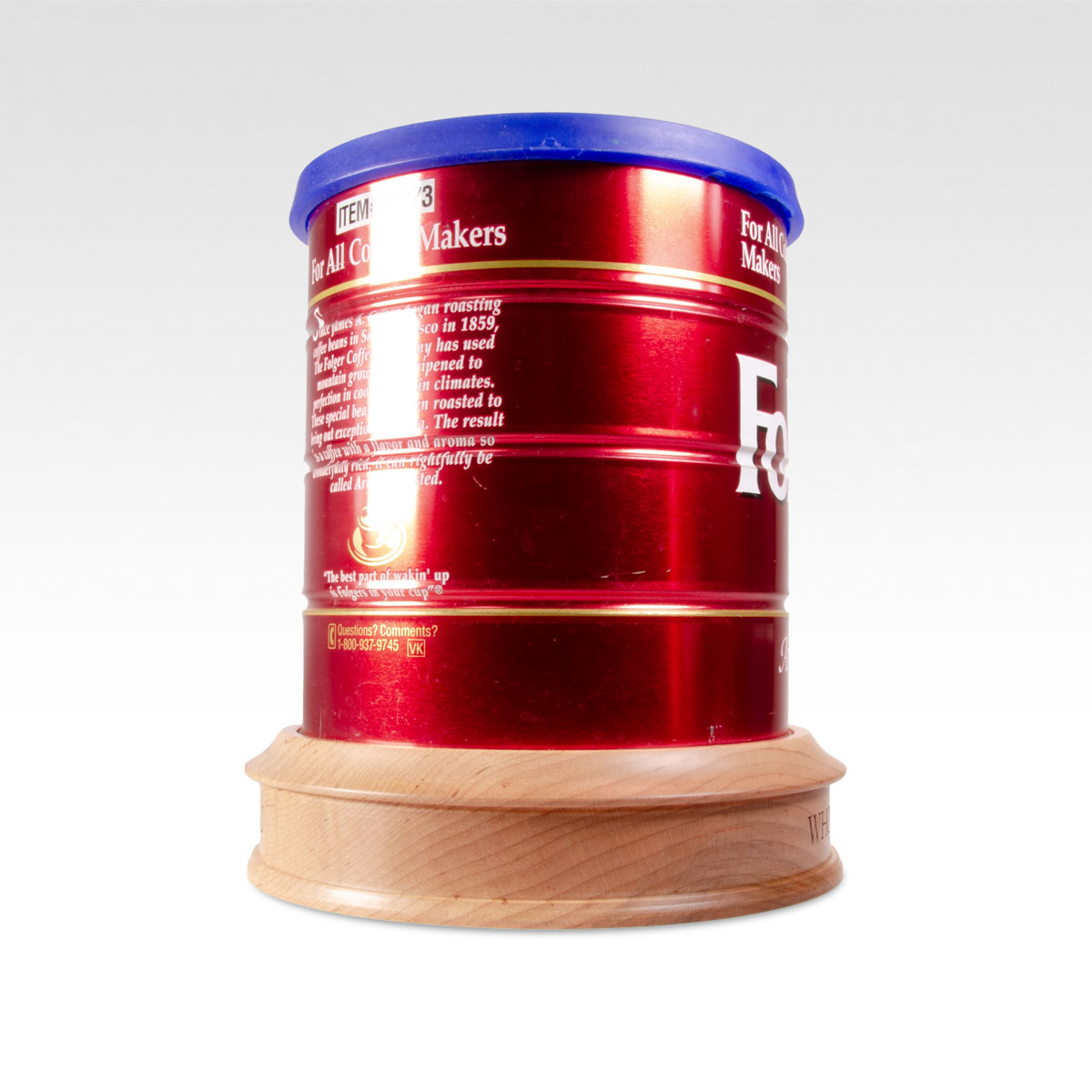 The largest coffee can houses only approximately 185 cubic inches of volume. This may make it unsuitable for whole cremated remains unless the deceased weighed less than 185 pounds in life. Late 20th-century vintage Folgers coffee tins sourced from an online auction and cast silicone blue lid. This can will have good structural integrity but may show signs of age and prior use, such as small amounts of rust and scuff marks. The can will be cleaned from its previous lives of drudgery to serve as a prop replica for display or as a functioning urn for cremated remains