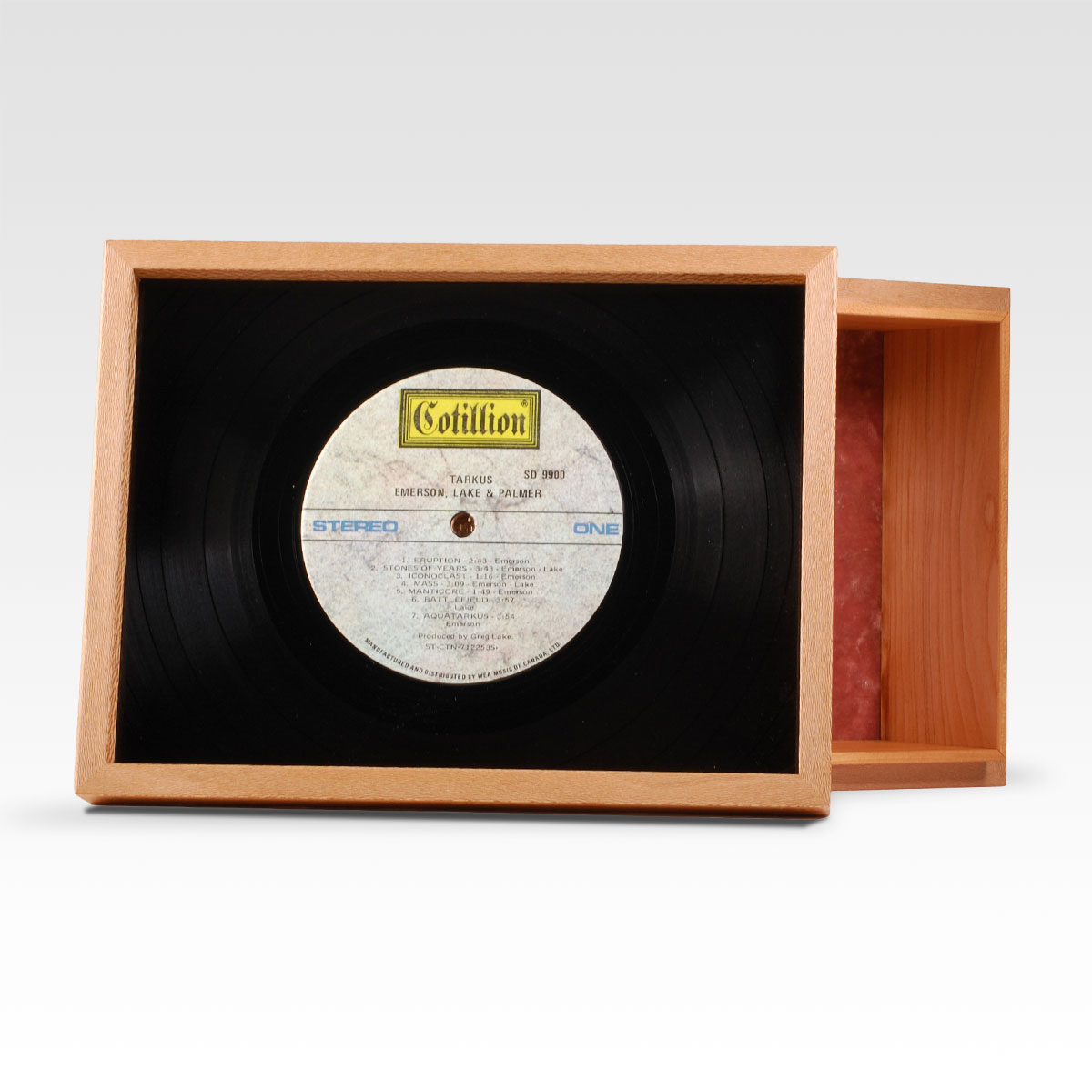 Inside, a velvet-lined chamber offers a resting place that feels hushed and tender, a final refuge touched by care. At the vinyl record center, a subtle accent of copper leaf catches the light in fleeting, delicate flashes – a moment of radiance that drift like memories rising to meet you.
